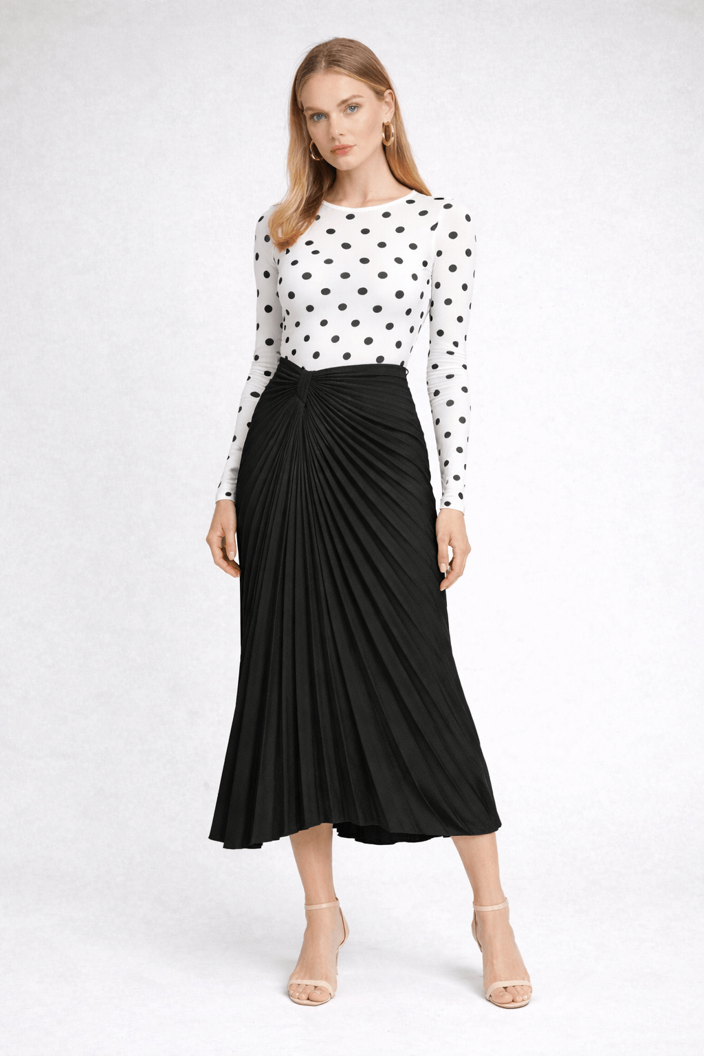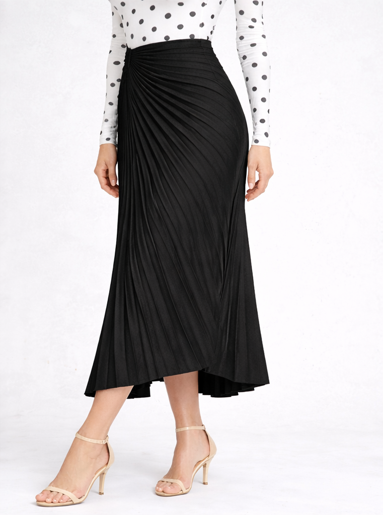 Shell skirt is sleek and stylish with a dash of hand pleates and a twist waist detail.