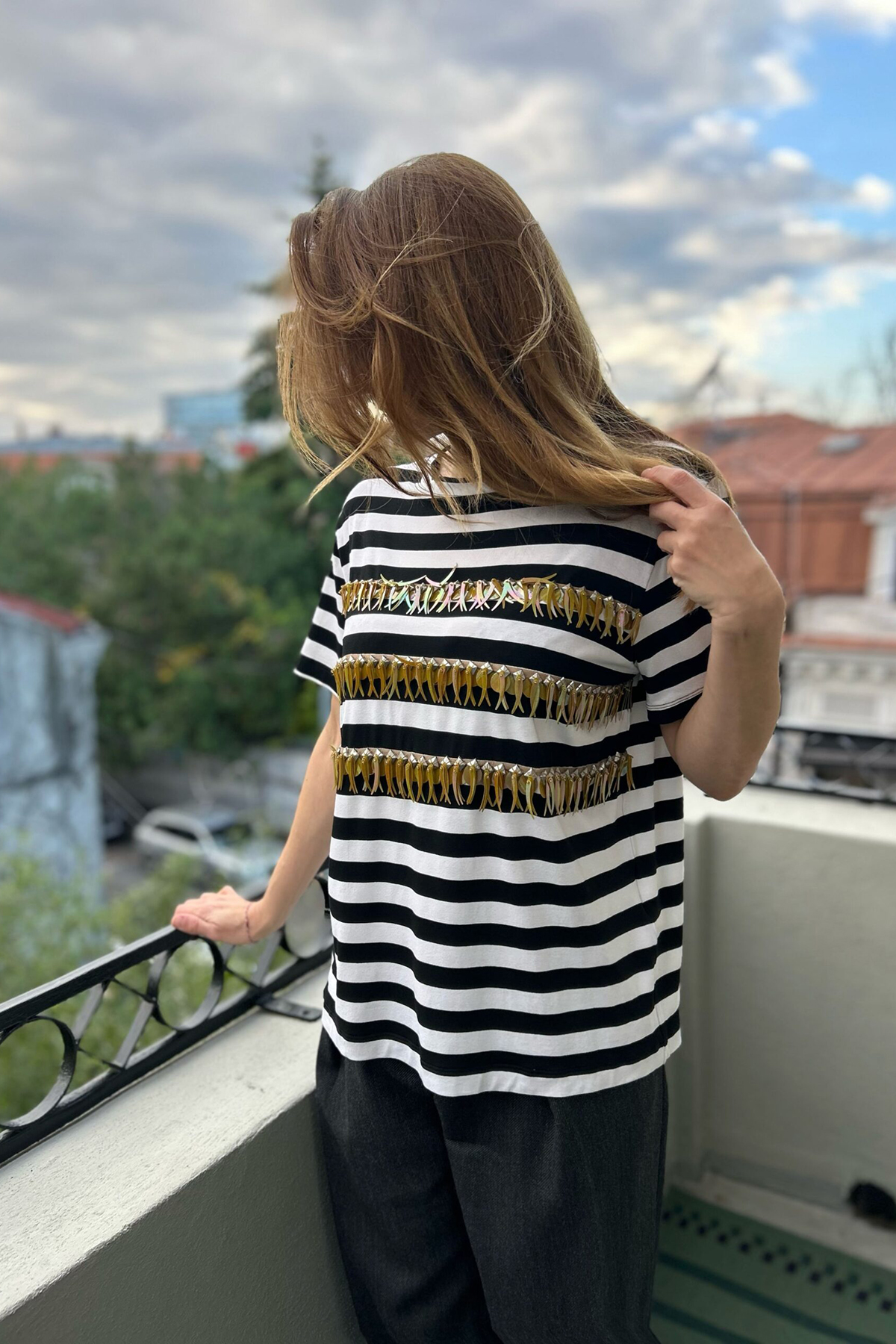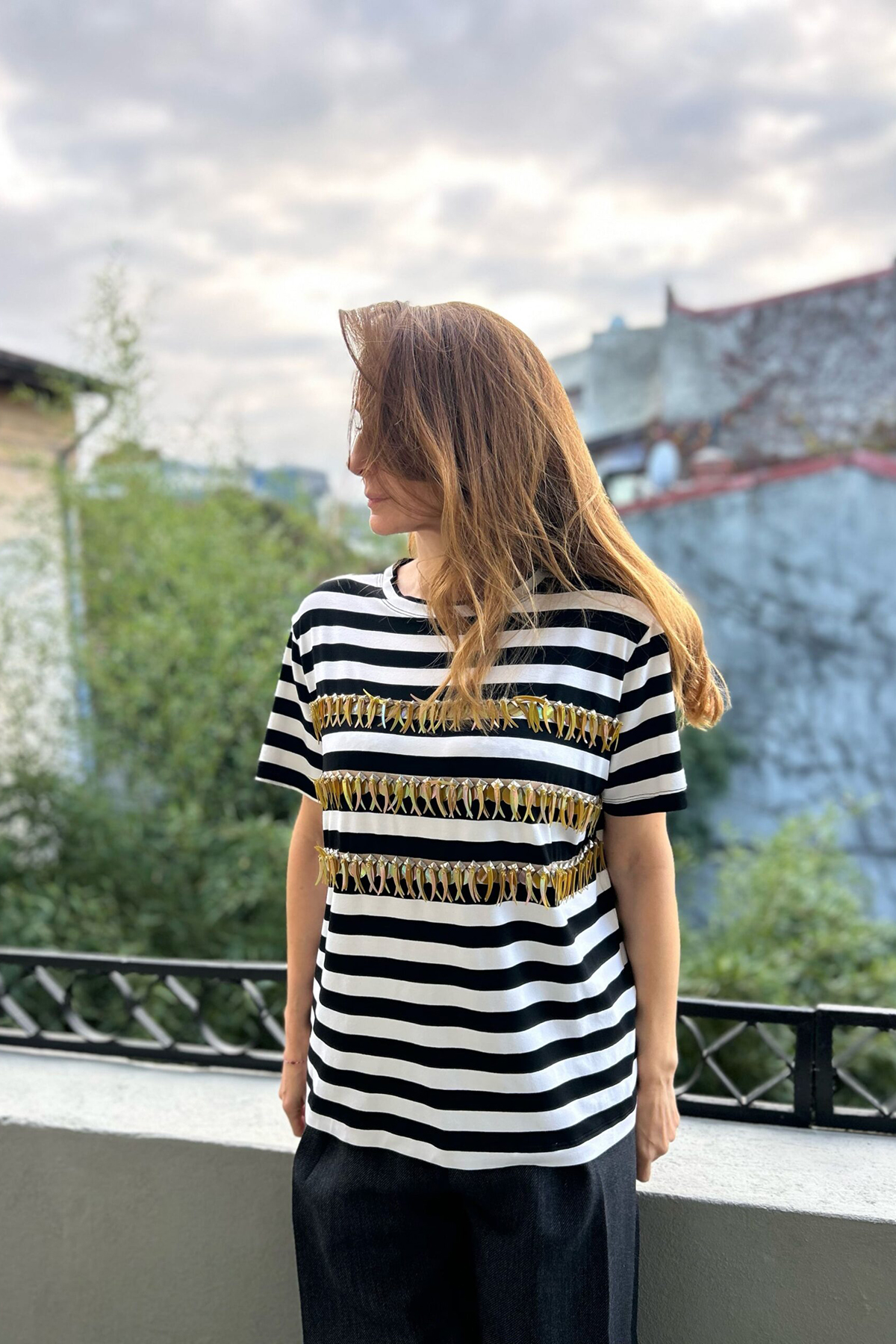 Precious Top comes in a relaxed shape that’s appliquéd with stripes of embroidery for a glam touch.